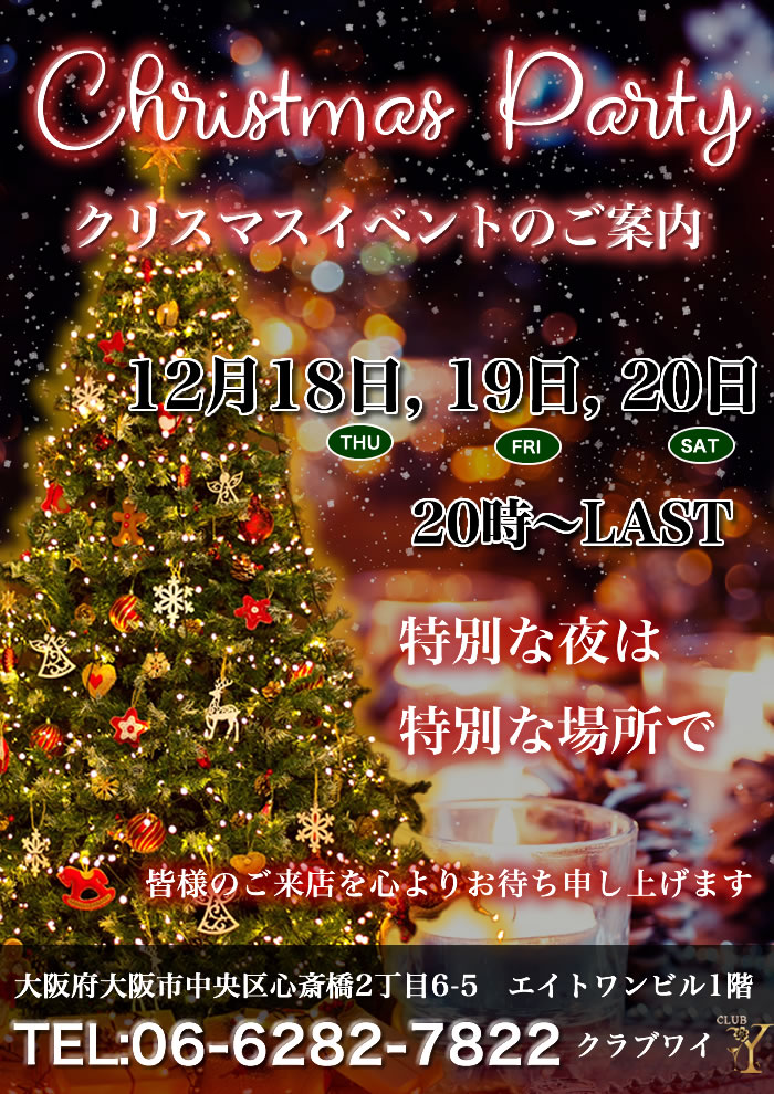 イベント 2025年クリスマスイベント開催! 2025年12月18日(木) / 19日(金) / 20日(土) 20時~25時 2025年12月18日(木)~20日(土)の3日間、クリスマスイベントを開催いたします。皆様のご来店をスタッフ一同心よりお待ち申し上げます。 club Y クラブワイでは季節によって様々なイベントを計画しています。新しいイベントは本ページで発表いたしますのでご期待くださいませ。 今までのイベント例